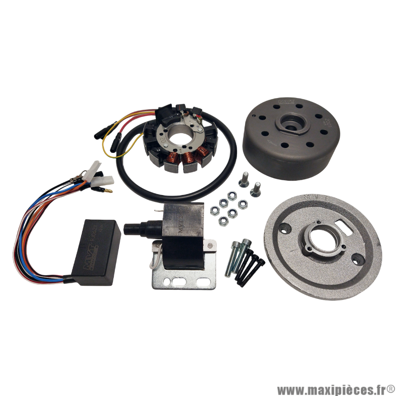 MVT est une marque d'origine française et est devenu rapidement le spécialiste des pièces d'allumage. Ainsi, nous proposons des allumages complets MVT pour mobylette. Parmi eux, nous trouvons les allumages MVT Premium qui sont dotés de faisceaux électrique qui permet la mise en place d'éclairage ainsi que d'un rotor interne en aluminium. Cet allumage MVT Premium a été conçu par les ingénieurs de la marque qui ont mis près de 7 ans pour arriver à ce superbe résultat.